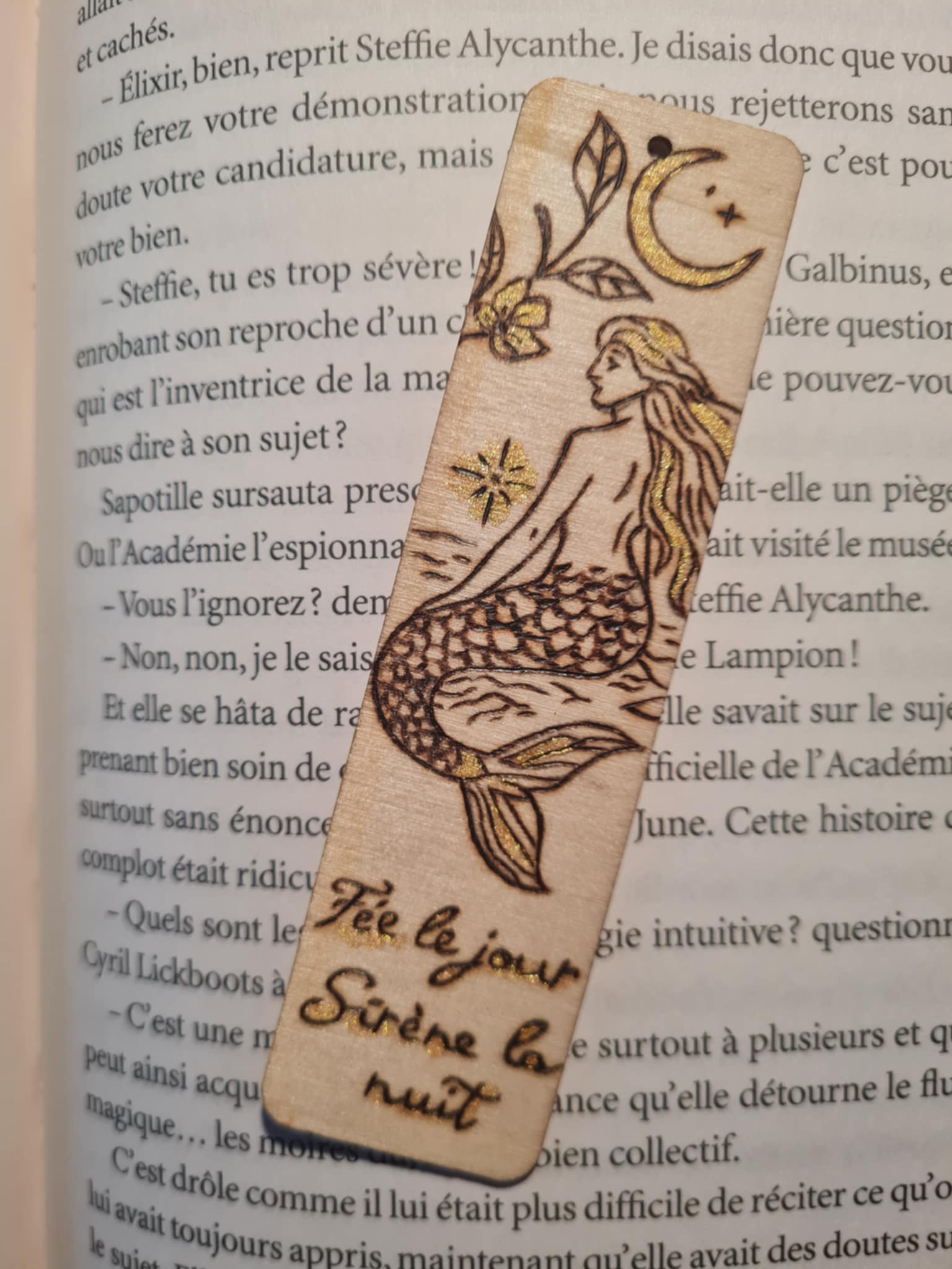 ✨ Finitions : Dorures scintillantes sur la lune, la queue de sirène et les étoiles