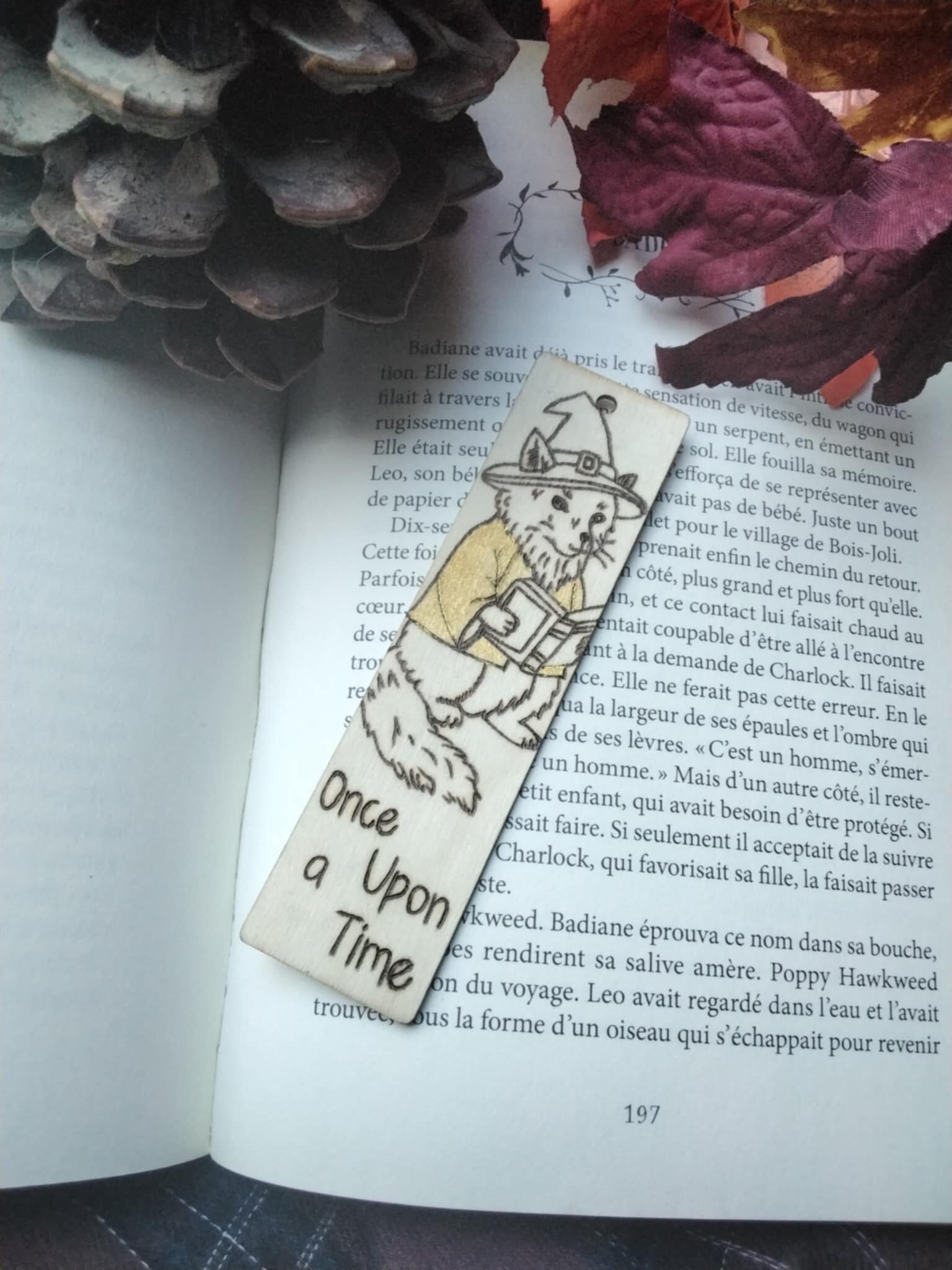 Marque-page artisanal « Once Upon a Time » gravé à la main par pyrographie sur bois naturel.